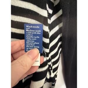 Apt 9 women’s black and white striped tunic sweater in size Medium featuring a chic turtleneck and flattering asymmetrical handkerchief hem. Solid black top with horizontal stripe detail through the body for a slimming, modern look.
