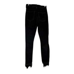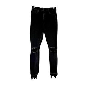 Mother The Swooner Dagger Ankle in Baa Baa Black Sheep with lace hem detail, size 28. High rise skinny silhouette in deep black stretch denim with button fly closure and distressed knees. The raw cut ankle is finished with attached tonal black lace trim that extends slightly past the hem for a romantic edge contrast against the structured skinny fit. Sculpting through the waist, hip, and thigh with ankle length cut that pairs perfectly with heels, boots, or sleek flats. Approx flat waist 13.5". Approx flat inseam 25" to 27" including lace drop. Cotton blend with stretch for comfort, recovery, and shape retention. Made in USA. Excellent preowned condition with intentional factory distressing and lace detail as designed.