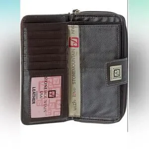 Large slip compartment for currency - Raised metal "Stone Mountain" logo on front snap - Signature Stone Mountain leather & fabric interior lining