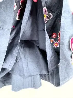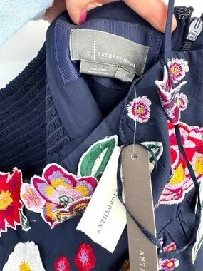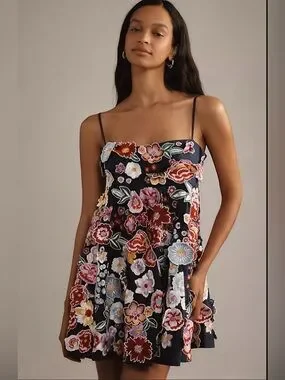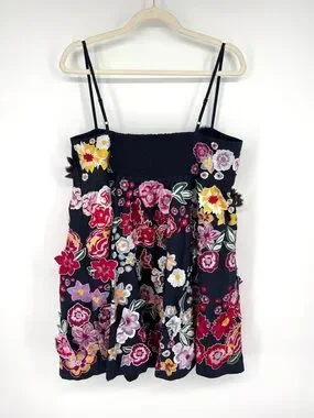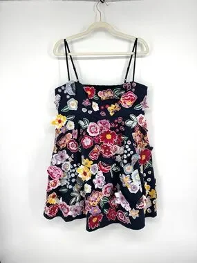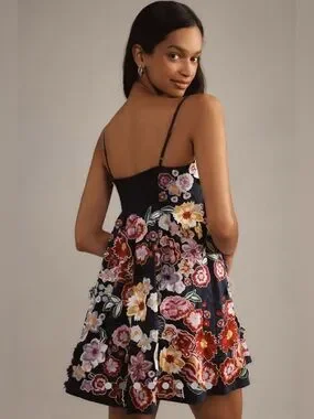 Anthropologie 3D Floral Embroidered Babydoll Mini Dress Navy Size Large