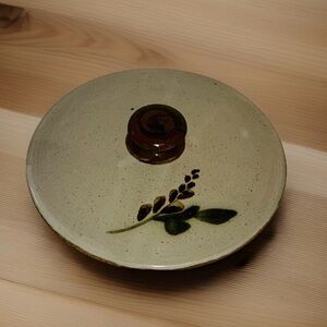 This signed studio art pottery lidded caserole dish vessel features a charming pattern of brown berries and green leaves, creating a unique and decorative piece for your kitchen. Made of clay with a tan color, this art pottery dish showcases a production style that adds a touch of artisanal craftsmanship to your cooking storage. This versatile piece combines both functionality and aesthetics in one.