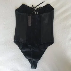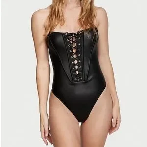 Victoria’s Secret Black Love Letters Faux Leather Teddy Bodysuit, NWT, Lace Up