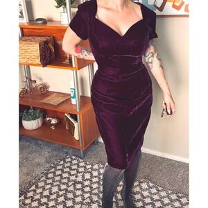 Vintage 1980s Plum Purple Velvet Wiggle Dress Sweetheart Neckline Cocktail Midi