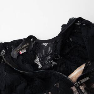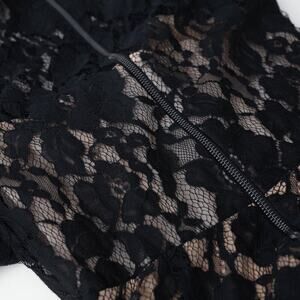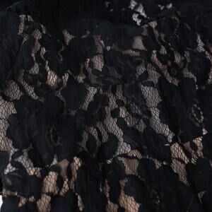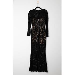 Black lace (Shell: 80% Viscose, 20% Cotton; Lining: 95% Polyester, 5% Elastane). Gown. Long sleeves. Boat neck. Back zipper closure.
