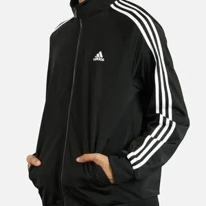 Classic Adidas Men’s Tricot Track Jacket in black with white 3-stripe detail.