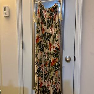 Vibrant tropical print dress. Features green leaves and orange flowers. Adjustable shoulder ties. Perfect for summer outings.