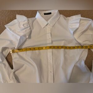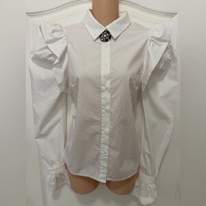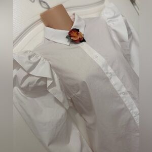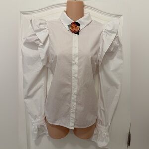 This elegant white blouse features stylish placket ruffle details, puffed long sleeves and ruffled cuffs. 100% cotton. Pair it with your favorite jeans, trousers, or skirt for that romantic cottagecore look.
