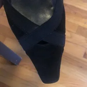 These Russell & Bromley heels by Stuart Weitzman are in the softest black suede with a black elastic criss cross detail across the top of the toe. They have kitten heel and are in good condition (see pictures for wear). A lovely pair of shoes by from Russell & Bromley.