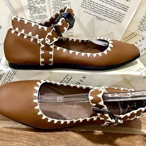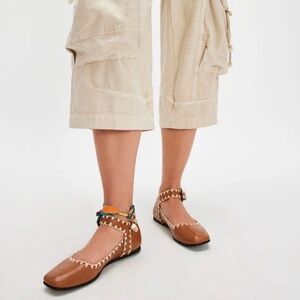 Free People Mystic Mary Jane Buckle Flat Tan Leather Ivory Crochet Trim