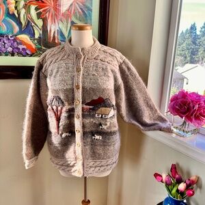 Fine Art Irish Landscape Cardigan Sweater w/ Sheep and Croft Cottage in a Pastoral Country Scene - a Hand Knit Sweater made in Cork Ireland by Rosemarie B. - Vintage 1980s NOS never worn perfectly stored and kept as a stunning work of knitting art.