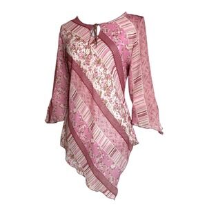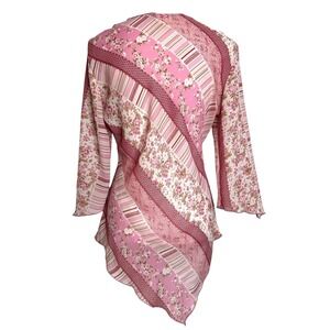 Vintage pink floral asymmetric tunic top with sheer layered fabric and flowy silhouette. Mixed stripe and floral patchwork print with soft fairy grunge aesthetic.