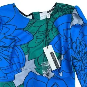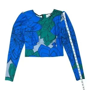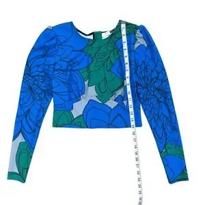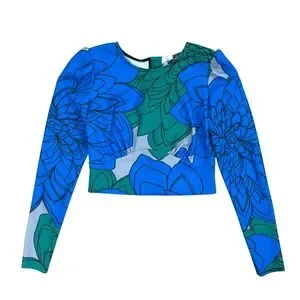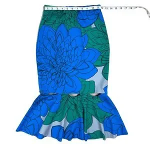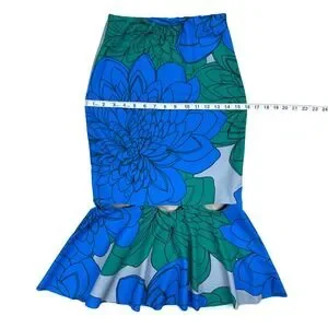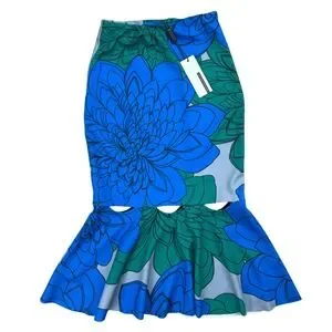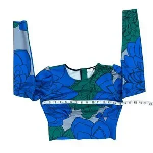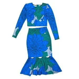 Bold floral patterns in vibrant blue and green tones define this striking two-piece set, featuring a long-sleeve crop top and a matching mermaid-style midi skirt. The top is designed with elegant puff shoulders and a sophisticated button-down back, while the skirt showcases a unique cutout detail at the knee that transitions into a dramatic flared hem.