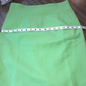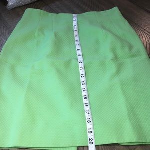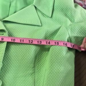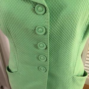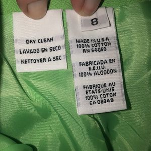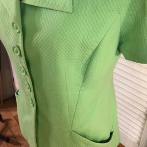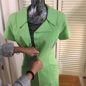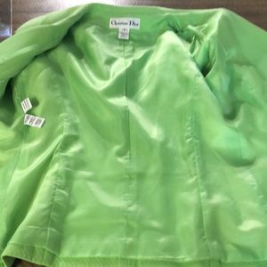 This neon-green blazer and skirt set by Christian Dior really turns heads—not just for its fun, Spring/Summer-time color, but its textured fabric and timeless cut. Features short-sleeve jacket with button front. Matching skirt completes the look. Just add a briefcase for the office, or a clutch purse for cocktail or social hour!