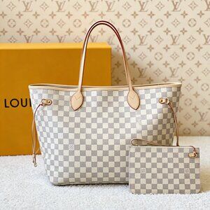 This iteration of the Louis Vuitton Neverfull GM features the iconic Damier Azur canvas with a neutral beige textile lining, offering a versatile and understated look. The natural cowhide leather handles and side straps provide durability and a refined finish, while the spacious interior and adjustable silhouette make it a practical yet stylish choice for any occasion.