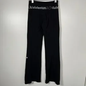 Lululemon Athletica yoga pants feature a classic flared leg and a signature branded logo waistband. These versatile black leggings are designed for comfort during yoga sessions or casual everyday wear. Signs of age.