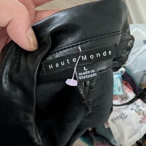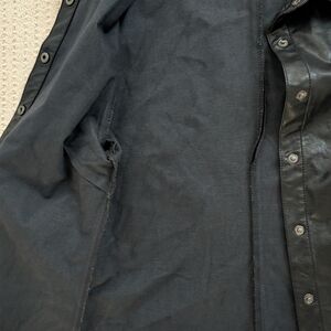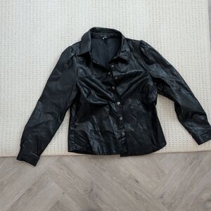 Stylish black faux leather shirt with button-up front. Perfect for a chic look.