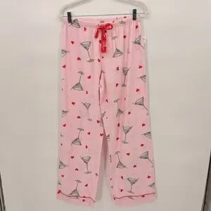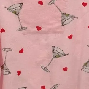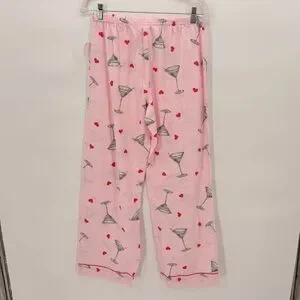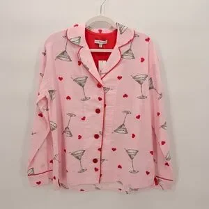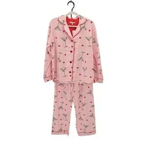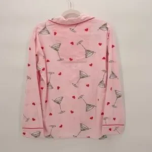 Cozy pink pajama set with martini and heart print. Button-up top with collar. Comfortable fit.