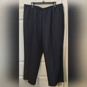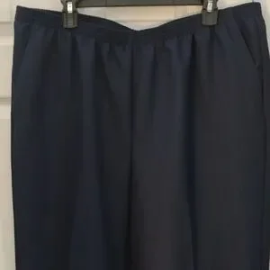 Sophisticated navy dress pants by Alfred Dunner with elastic waistband, 2 front pockets. Proportioned short fit, Ideal for formal and casual settings. Comfortable fit and timeless style. Size 18WS, waist measurements in photos, rise 16", inseam 26.5".