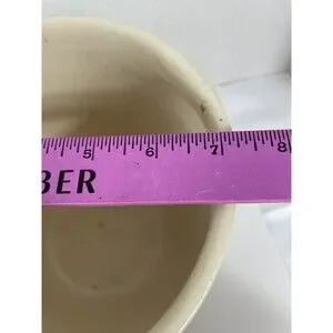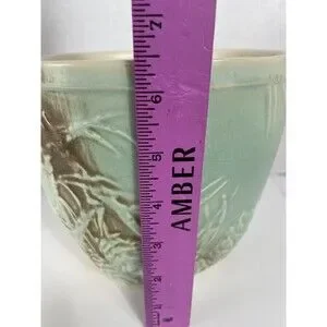 The jardiniere planter pot stands at 6.5 inches tall with a length and width of 7.25 inches. It has a matte finish and is a retired piece, adding to its collectible value. This item was made in the United States and bears the brand of McCoy. Its style is quintessentially 1940s and would make a great decorative piece for any vintage or mid century modern enthusiast.