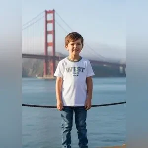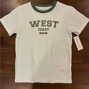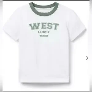 Chic white tee with 'West Coast' print. Green collar adds a stylish touch. Soft and comfortable for everyday wear.