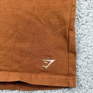 Gymshark Rest Day Essentials T-Shirt in a rich terracotta brown hue. This versatile top features a heavy-weight cotton feel with a relaxed, boxy fit and a classic crew neckline. Designed with drop shoulders and a small embroidered shark logo at the bottom hem, it offers a clean, minimalist aesthetic perfect for lounging or casual wear. The ribbed collar includes a subtle V-stitch detail for added texture.