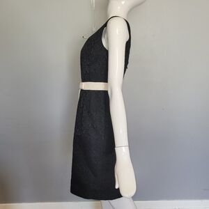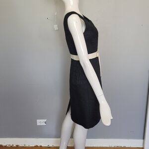 Channel your inner Audrey Hepburn in this dress! Jacquard weave fabric with a contrast waistband and bow, back zip, and rounded neckline at front and notched neckline at back. Totally reminiscent of Breakfast at Tiffany's.