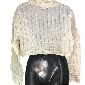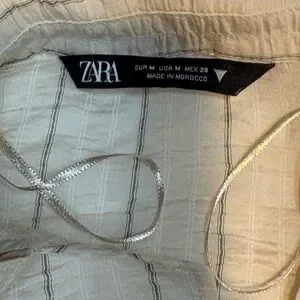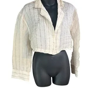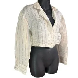 Zara women's cream striped crinkled blazer shirt top cropped medium