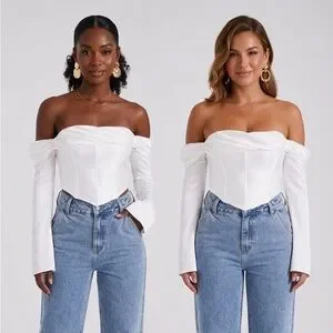 Chic off-shoulder design. Crisp white fabric. Perfect for stylish outings.