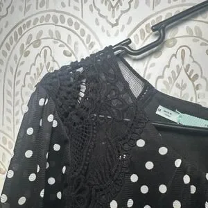 Keywords: polka dot, lace trim, keyhole neckline, long sleeve, sheer sleeves, charming, elegant, sophisticated, day to night, casual chic, feminine, trendy