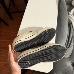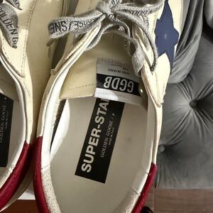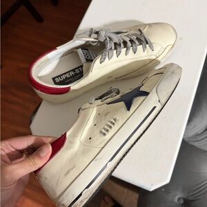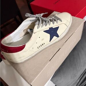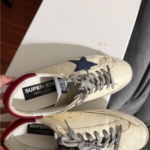 Golden Goose Superstar sneakers, worn twice in cream with navy star and red heel tab. Excellent condition with minimal wear.