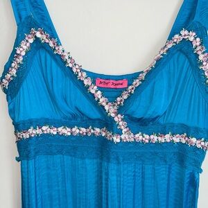 Betsey Johnson Teal Empire Waist Maxi Dress Floral Trim Size M
