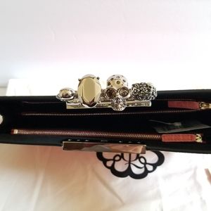 Features: croc-embossed leather, signature four-ring handle, iconic skull and crystal details, top clasp closure, silver-tone hardware, one interior compartment, two interior zip pockets, leather lining
