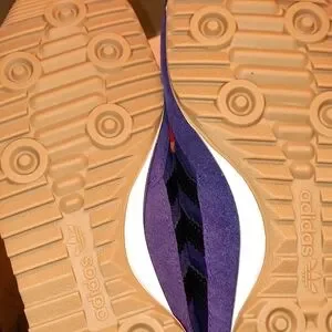 Premium Materials: The upper features a combination of lightweight nylon and soft suede overlays in a vibrant "Aurora Plum" purple color, accented by bold "Core Black" Adidas 3-stripes and heel tab.