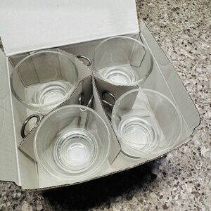 Bormioli Rocco - Set of 4 Espresso Cups, Used 2 to 3 Times, Great Condition, Made in Italy. Cardboard packaging has shelf wear and some stains but cups are in very good condition.
