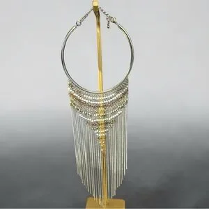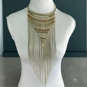 Stunning gold tone statement necklace featuring layered beadwork and dramatic cascading fringe chains. This bold bib collar creates beautiful movement and instantly elevates any outfit.