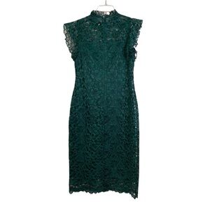 Our flattering-for-all high neck dress in a beautiful emerald green floral lace. Back Zip, Short Flutter Sleeves, Lined.
