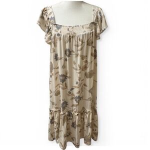 Wonderly women's size Medium floral midi dress in soft neutral tones of beige, blue, and tan. This feminine dress features a flattering stretch smocked bodice, elegant square neckline, and delicate flutter short sleeves. The flowy silhouette with a tiered ruffle hem creates a relaxed boho, cottagecore, prairie-inspired look.