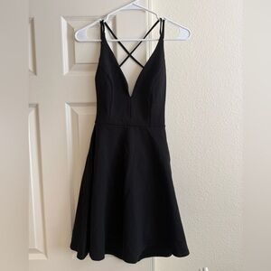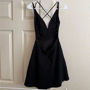 Short black dress with a backless strappy design. Features a deep V-neck and spaghetti straps. Perfect for a night out or formal event!