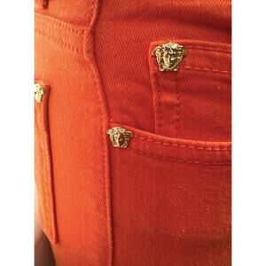 These Versace runway coral denim jeans are a true statement piece. Designed in an eye-catching coral hue, they feature Medusa motifs throughout—an iconic symbol of the house that instantly elevates the look.