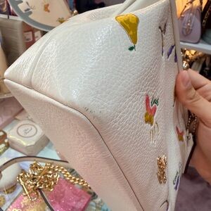 Chic Coach clutch with colorful gaden accents. Features a secure clasp and elegant design.