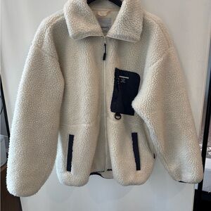 Stay cozy and stylish with this cream sherpa jacket featuring navy accents. Perfect for chilly days.