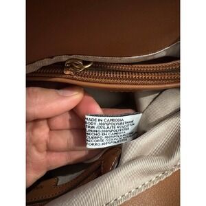 Nine West Sutton Place tote bag combines a classic silhouette with a modern textured aesthetic. This stylish carryall features a unique woven cage overlay in caramel-toned faux leather over a neutral canvas-like textile base. Designed with dual top handles and a spacious interior, it serves as a versatile accessory for daily commutes or weekend outings. The gold-tone logo hardware on the front adds a touch of sophistication to the earthy color palette.
