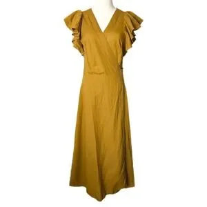 Madewell Linen Blend Ruffle Sleeve Wrap Midi Dress Antique Gold. Brand new with tags. Note: Small dark marks are present on the fabric near bottom back hem as shown in the detailed photo. Size Small.