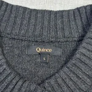 Branding and tags: Interior woven label reads Quince; size tag reads L; sewn care tag shows machine wash cold delicate cycle, non-chlorine bleach when needed, tumble dry low as shown.