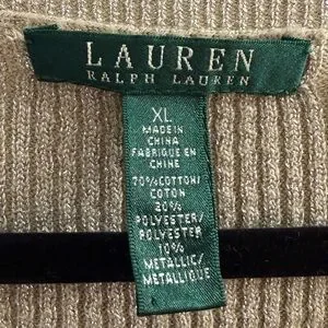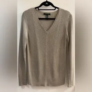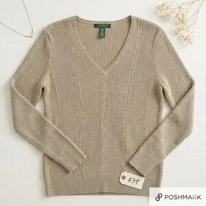 Add a touch of elegance to your wardrobe with this beautiful Lauren Ralph Lauren sweater. Featuring a sophisticated gold metallic shimmer and a flattering chevron ribbed knit design, this piece is perfect for dressing up or staying chic and casual.