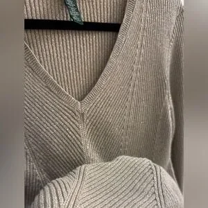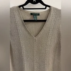 Lauren Ralph Lauren Gold Metallic V-Neck Sweater XL Shimmer Ribbed Knit