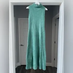 Elegant green maxi dress. Sleeveless with high neck. Ribbed texture. Perfect for casual or dressy occasions.