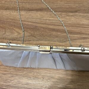 Vintage Gunne Sax by Jessica McClintock satin evening clutch in a soft silver/pale gray tone. Features an elegant pleated front, structured gold-tone metal frame, and a delicate chain strap that can be worn on the shoulder or tucked inside for classic clutch styling. Originally sold as part of Gunne Sax’s formalwear line in the late 1970s–1980s, these clutches were popular for proms, weddings, and special occasions. Perfect for bridal, prom, vintage formalwear, or minimalist evening events.