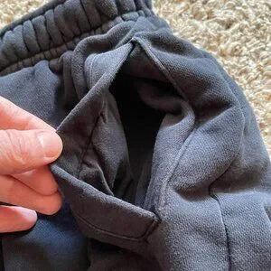 Features: Elastic waistband with adjustable drawstring, two side hand pockets, and one back pocket with snap closure.