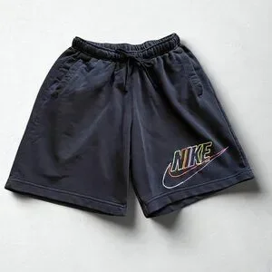 Upgrade your gym or lounge rotation with these comfortable Nike athletic shorts. Featuring a soft fleece interior and a unique multi-color "staircase" embroidered Nike logo on the left leg.